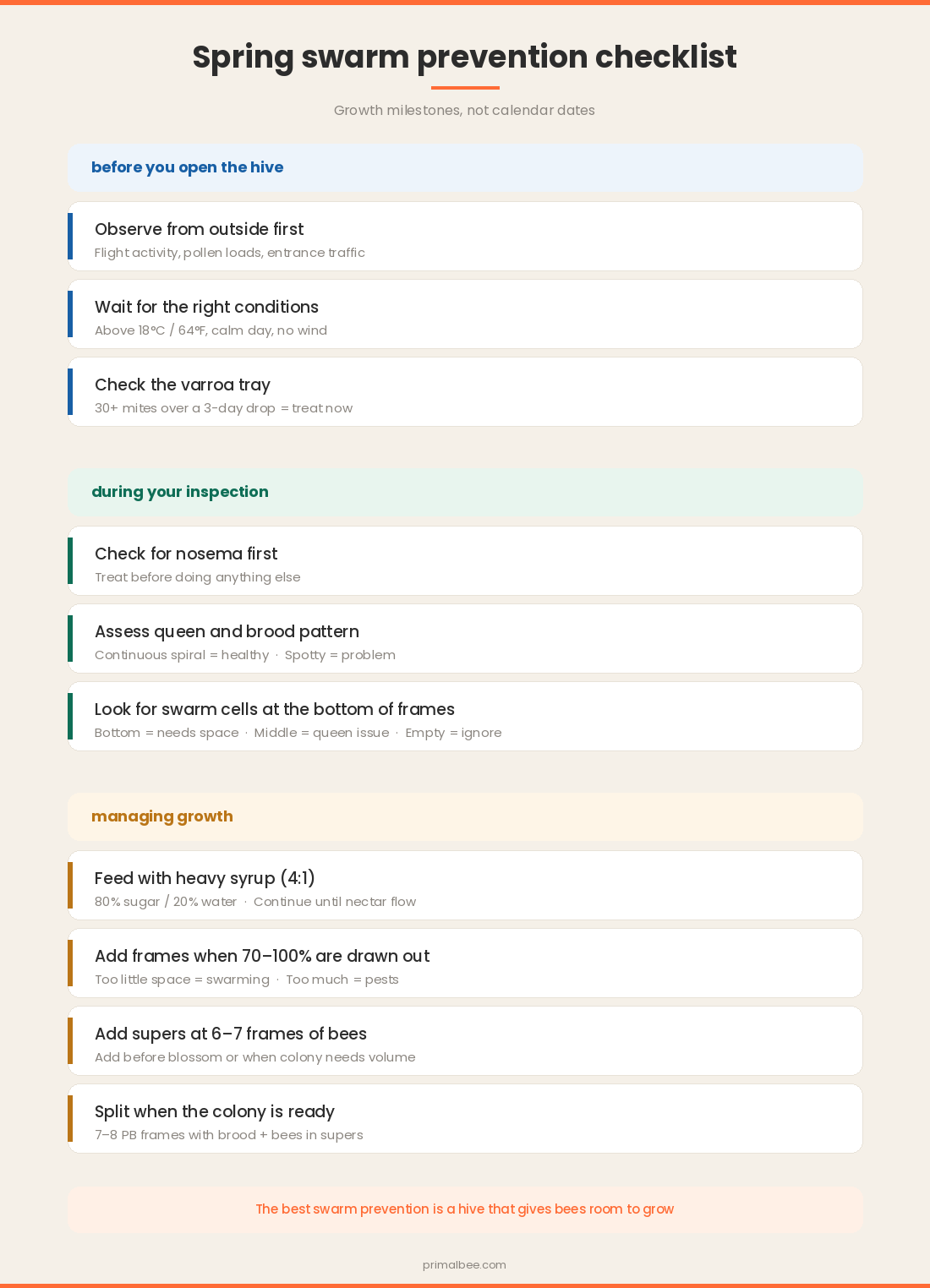 The real swarm prevention question isn't "are there queen cells?" It's "does this colony have enough room to grow?"